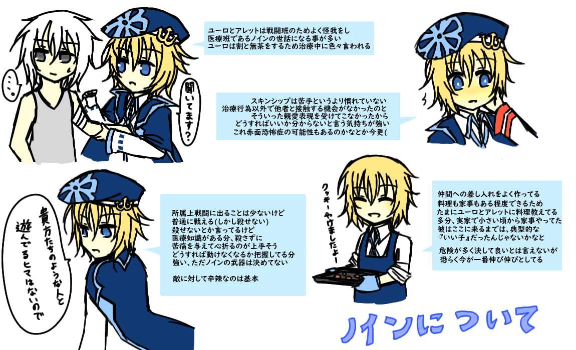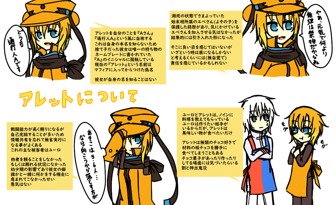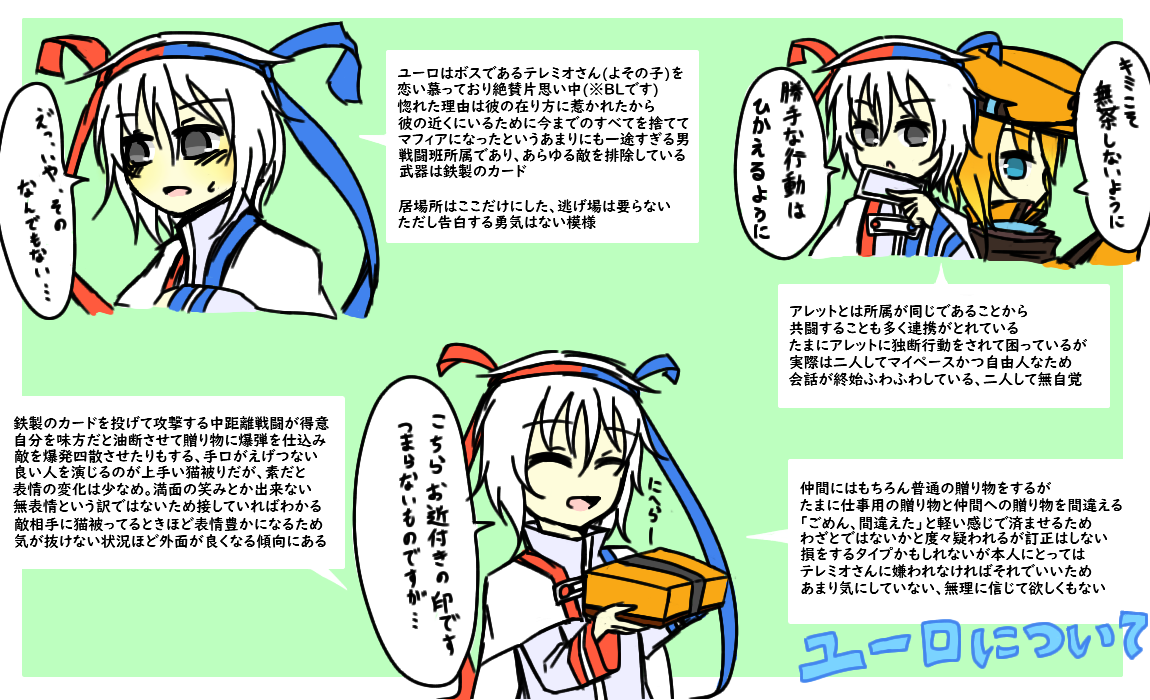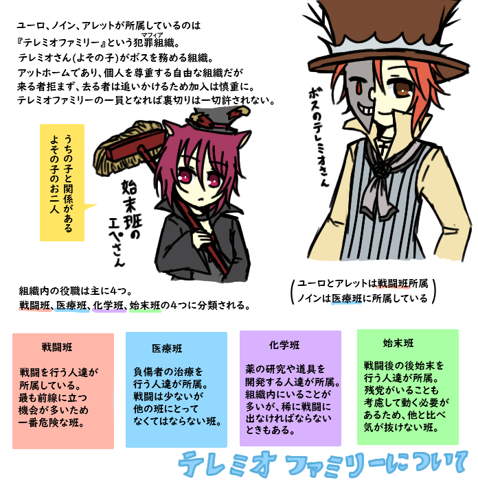 × [PR]上記の広告は3ヶ月以上新規記事投稿のないブログに表示されています。新しい記事を書く事で広告が消えます。 マフィア ユーロ:トゲキッス♂ 当時の私の趣味を詰め込んだ結果が彼だった記憶があります ユーロさんはこんな澄ました顔してボスのテレミオさんに ベタ惚れなのが最高なんですよ、めちゃくちゃかわいい 告白する勇気ないけど自分からスキンシップ取ったりするんですよ 「テレミオさんがいたからここに入った」とか言っちゃうんですよ 最高かよ……( でも困らせるのが怖くて告白しないんですよ彼 テレミオさんがユーロが恋い慕っていることに気づくのが早いか ユーロが勇気を出して告白するのが早いか、どっちでしょうね ユーロはテレミオさんの幸せを願ってるから告白するにしても 大丈夫って思えるようにならないとかなあ、道のり遠いですね? 追記でうちのマフィア組が所属してるテレミオファミリーの紹介を 自分なりにしたものと、マフィア組三人の簡易的な紹介を置いてます 元々ポケ擬やってない絵描きの友人に「この子気になる」と言われ プレゼン資料としてまとめたものですが参考程度にはなるかと こういう資料作るのは楽しくていいですね!妄想が捗る!! マフィア組の所属している『テレミオファミリー』について 自分なりにプレゼンしようとした結果です(自分解釈有り) マフィア企画主催者である水音志穏さんこと、しーさんのお子様 テレミオさんとエペさんを勝手ながらお借りしました…!! うちの子を紹介するにはこのお二人は必須だと思うので…… 勝手にお借りしてごめんなさい!描くの楽しかったです!好き!!( マフィア ユーロ:トゲキッス♂ テレミオさん第一な奴だから本当色々ぶっ飛んでるところあるけど 本人は至って一途なだけなんだ……私的なイメージとしては テレミオさん>>>仲間>越えられない壁>その他>>>敵 こんな風に書いてるけどユーロは仲間のこともかなり大切に思ってます だからこそ無理してまで自分を良く思ってほしくないし好いてほしくない 嫌なところは嫌なままでいいし、遠慮せずに言ってくれて構わない 仲間だからこそ、そういうのはちゃんと言ってほしいし隠してほしくない 彼のそれは伝わりにくいんだなあ、だから彼は損をするタイプかもしれない 元々穏やかな性格ではあるし心優しいんだろうけど、一回すべて捨てたから 取捨選択とか切り捨てることに関して彼は潔すぎるのかもしれない マフィア ノイン:エンペルト♂ 戦闘班じゃないからこそ戦闘時のギャップ過ごそうだなと思うノイン 殺しはできないししない、多分殺してしまったら色々不安定になりそう 元々裏社会の人間ではなかったし、医者志望だったから流石になと ただ彼は怪我の治療が主な仕事だし敵の心折ることに対して容赦なさそう まあやらなきゃやられる世界だし仕方ないね、そういう優しさはいらない 殺さないことに関しては甘いだろうけど彼は完全に裏の人間だよっていう あとどうすれば動けなくなるとかを一番把握してそうでやばいなと思った そういう普段優しいというか、無害そうな子がやばいのめっちゃ好きです マフィア アレット:★エレキブル♀ 彼女のことを知らないと不思議な人だなと思われてしまう感じの不思議ちゃん(?)枠 面倒見がいいけどマイペースで自由人、無言実行の人だから余計そう思われがち チョコがあればとりあえず大人しくなるしどこからともなく寄って来る、子供っぽい アレットがなんで名前をあまり名乗らないのかとか色々説明してなさすぎてな…… 武器のこと書くの普通に忘れてたけどスタンハルバードです、あと素手でも戦える 戦闘能力は三人の中では一番高いが、たまに情報共有を忘れてしまうのが玉に瑕 基本的にテンションは一定だがチョコ食べてるときは幸せそうにしてる、かわいい PR ● コメントフォーム |