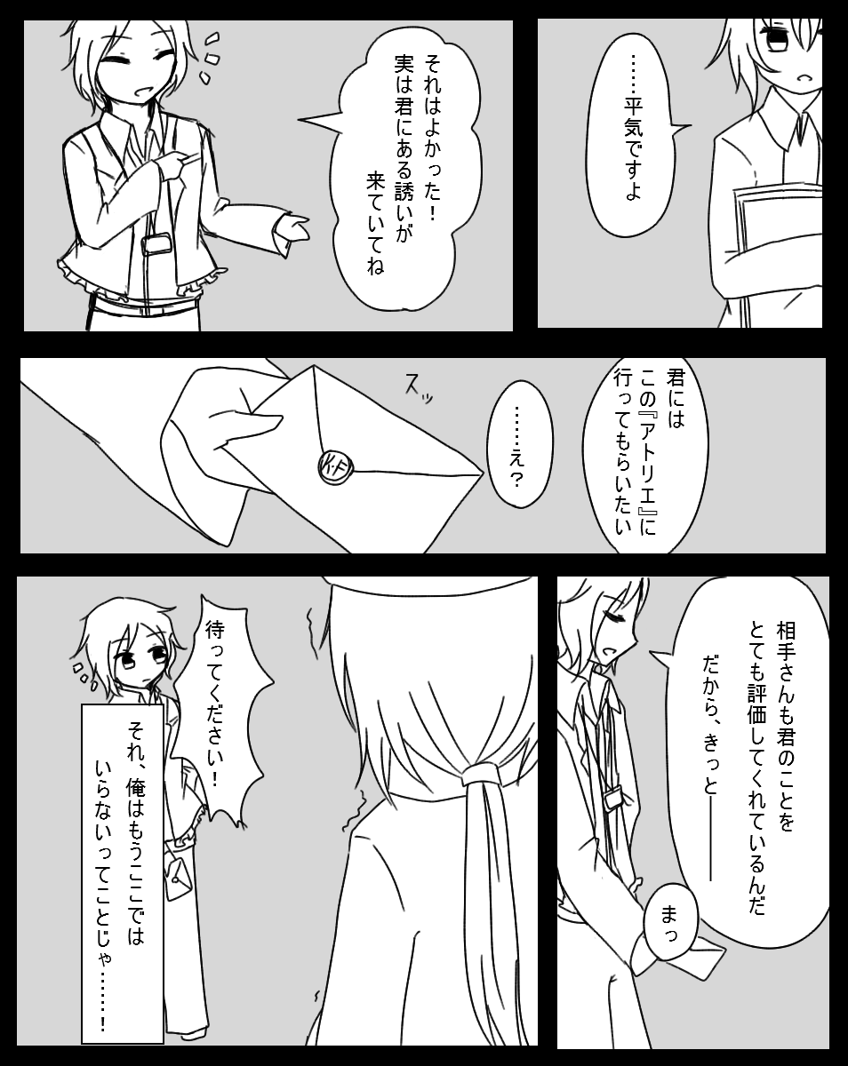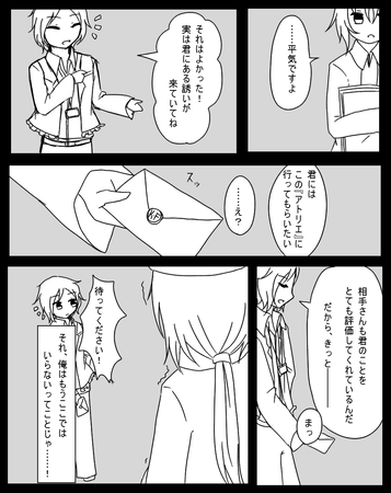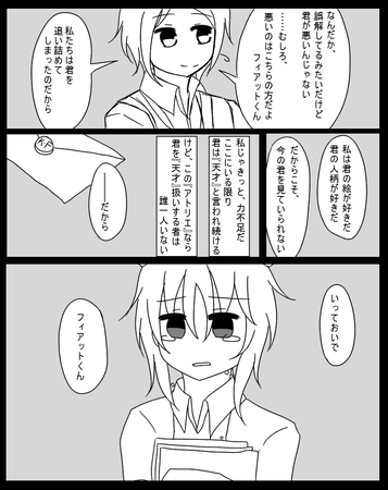 × [PR]上記の広告は3ヶ月以上新規記事投稿のないブログに表示されています。新しい記事を書く事で広告が消えます。 アトリエ フィアット:★ドーブル♂ 昨日のキスの日絵を描いた後、フィアットが アトリエ組に加入した経緯を考えていたら 色々爆発したので即席ですが追記に文章と漫画をば! 即席なのでバランスとか言葉とか色々と酷いです 閲覧の際は深く考えずにお読みください 漫画に関してはもう別物な気もしますが、まあ…… 少しずつ漫画も描けるようになったらなって思います 話の都合上、フィアットがいた美術館の館長が出てきますが 彼もまた即席です。一応クマシュンになる予定? そもそも出すつもりがなかったので診断で決めました ただ漫画では館長仕様で原型要素が薄いので あまり関係なかったかなと思います 館長仕様じゃなかったら帽子とかポンチョ着せたい 着せようか悩んだけど館長がそれってどうなんだ…… と思ったのでやめました、やめてよかったと思います 天才って言葉、実際はどうなんでしょうね 一般的な褒め言葉ですし、良い言葉なんでしょうけど 私はあまり好きになれないのです 向けられたことは一度もないですが 努力を天才って言葉で片付けられてないかと 秀才とか努力家とかそう言った言葉では駄目なのかと 思ってしまうのは少し、ひねくれ過ぎでしょうか 秀才や努力家という言葉で言い表せない その人の凄さ・魅力を表現しているのでしょうかね そう考えることはできても、納得できないのが きっと私の悪いところです 今回の話は『悪意のない称賛でも、重くなることはある』 と言う感じです、興味のある方は追記からどうぞ 内容はあまり明るくないです 天才画家として名を馳せた、ある美術館で働いていた少年。 美術館の館長にその能力を買われ、美術館専属の画家となる。 描く作品の評価は高く、また高い値がつけられた。 しかし、少年自身の人柄を重視する者は誰一人いなかった。 能力のみが評価され、『天才』というレッテルを張られた。 少年の人柄は観衆の想像上のものが独り歩きしだし、 こういう人物が絵を描いているということが世間に広まっていた。 そのことに少年が気づいたとき、彼は叫びだしたくなった。 「自分はそのような人物ではない」 「そんな思いで絵を描いたのではない」 だが、それを口にしたとしてどれほどの人が耳を貸すだろうか? イメージが定着してしまえばどうにもならない。 深くかかわらない限り先入観で判断されるのが常だ。 なぜそう思われるのか、その最たるものは何か。 自分に向けられる多くの称賛の中で一番言われているもの…… その言葉が、少年にとって嫌いな言葉となった。 「『天才』なんて言われたくない」 天才などと言われなければ、 そのようなイメージを持たれなければ、 こんなことにならなかったのではないか。 そもそも、絵を描かなければいいのではないか。 そう考えたこともあったが、少年は絵を描くことが好きだった。 やめることなどできなかった、こんなことでやめたくなかった。 しかし、自身を『天才』と呼ぶ声は収まることを知らず、 むしろ増える一方だった。どうしようもないと悟った。 耳を塞ごうにも、職員からは「評判良かったですよ」と 悪意のない称賛と羨望の眼差しを向けられる。 唯一、自身が追い詰められていることに 彼をスカウトした館長が気づいたときには、 もう嫌になっていた。 いろんなものが怖くなっていた。 描きたいものを描いていただけのはずだった。 こんなに気が重くなる作業ではなかった。 それがいつから、こんなに楽しくなくなったのか。 誰かが望むものであり続けたいわけではない。 自分の為に描けばいい、そう思っている。 だが、『天才』というレッテルでしか自分を見てもらえない。 少年はそう考えるようになっていた。 自分が分からない、観衆の評価であるそれが正しいのか。 自分の絵から感じ取られるイメージがそうであるなら、 そのように解釈するのであれば、そうなのかもしれない。 そのことを頭の中で何度も否定したが、気が晴れなかった。 少年は一度だけ、自分の為に描くことをやめた。 観衆の望むものを、観衆のイメージに合わせて。 今までの作風とは全く違う一つの作品を描き上げた。 それが評価されなければいいと思いながら―――。 しかし結果は少年が望んだものと正反対だった。 今までの、どの作品よりも評価され脚光を浴びてしまった。 このことで少年の心が折れた、自分を出すことが怖くなった。 「この人らしくないね」という声が聞きたいだけだったのに、 その声が届かないくらいの湧き上がる称賛に身をすくませた。 それから、絵を描くことが怖くなった。 描いても、表に出せなくなった。 美術館に顔を出すことはある、絵を見ることは好きだから。 館長は無理しなくていいと言ってくれた、少しだけほっとした。 少年が描いたという作品を館長に見せると、館長は問いかける。 「それは、