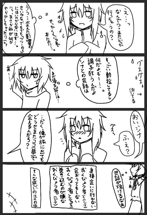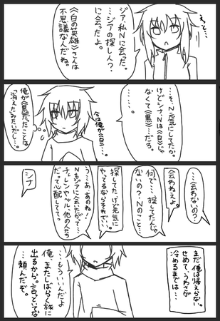 ただ単に縦長になったから追記に置いてます 俺設定すぎてもう何が何だか(考えたのはお前だ W ジア:オリトレ♂ B2 シナ:オリトレ♀ B2二軍 フォセカ:ムシャーナ♂ 話の流れおかしいとか分かってますので突っ込まないでやってください シナ殿堂入り後のNイベント後くらいの話、ひたすら文字が多い フォセカに頼んでジアの夢とつなげてもらいました 私にマンガ向いてないの知ってますけど、まあ形だけのもので 本格的にマンが描いていくつもりないしいいかなって ジアは自分が黒の英雄だったことを覚えているけど 何故かNと英雄での立ち位置が変わっていて戸惑ってたりもした 原因はシナだけど普通の人は何も感じないからいいかなと思ってたり 違和感を覚えたのはジアとN、レシラムゼクロムの 当事者くらいじゃないのだろうか? PR ● コメントフォーム |