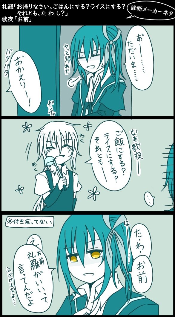 × [PR]上記の広告は3ヶ月以上新規記事投稿のないブログに表示されています。新しい記事を書く事で広告が消えます。 SS 礼羅:サンダース♂ 歌夜:クロバット♂ 診断メーカーのお題で描いたもの、私の推しコンビ兼CPですよろしくお願いします 仕事中なにかしらやらかした礼羅が誤魔化そうとした結果、すぐ手が出る歌夜さん 礼羅は悪ノリはするけど仕事のことで言い訳はしなさそうだなと思いました 仲間が損を被るのが嫌なだけですが、いつかはバレだろうし欺けるとも思ってない 本気になれば隠し通せるし何とかできるスペック自体はあります、多分 本人に意思と自信がないだけで器用なんじゃないかなあ礼羅は 他が突出してるからそのフォローに回ってるだけで、ね 歌夜は手が出やすいとか怒りっぽい設定をようやく出せた感ありますね? つい甘い感じとか優しくしがちですが……いや歌夜優しいんだけど手が早いので その辺ちゃんと描写したいですね!ちゃんと表現できるように頑張りたいですね あと家事とか仕事引き受けて一人で片付けちゃう的なことも掘り下げたい……! 無自覚に無理していくスタイルです、なのでその時は周りが無理やり休ませます 追記で他診断メーカーお題で歌礼+紫 歌礼+紫(※歌夜は疲れている) 礼羅「し、紫苑ー!!歌夜がっ!歌夜が壊れたあああ!!」 ↓紫苑が来てくれました うちの歌礼さんはだいたいこんな感じ。歌夜の押しが強い、愛もそこそこ重い 礼羅はそれに戸惑ったり流されたり逃げたりしてる。嫌いではないしむしろ好き ただ「歌夜が俺に恋愛感情?ええー……流石にそれは、嘘やろ……?」状態 礼羅の好きの感情は恋愛ではないはずなんけど、嫌いじゃないから拒めないし 傷つけたくもないし与えられたら答えないとなあってタイプなのでわたわたする 歌夜は歌夜で時々妙に吹っ切れたり、無自覚で(酔った時や疲労時に)暴発したりする 礼羅のことはそういう意味でも好きなんだろうなって自覚はあるから あわよくば礼羅に自分のことを意識してもらいたいし気持ちは伝えていく所存 ただ礼羅が素でスキンシップ多いし自覚なしで好意を向けてくるから心臓に悪いから 歌夜も歌夜で礼羅に振り回されてるって言う。こういうのとても好きです、はい PR ● コメントフォーム |